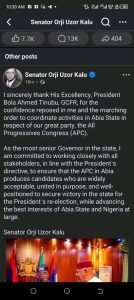 However, in a separate statement, Orji Uzor Kalu declared that he had been given the mandate to coordinate APC activities in Abia, emphasizing his role as a senior political figure and long-standing stakeholder in the party.