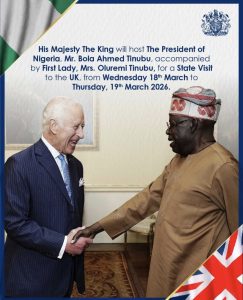 Buckingham Palace has confirmed that President Bola Ahmed Tinubu and First Lady Senator Oluremi Tinubu will undertake a State Visit to the United Kingdom from 18 to 19 March, marking Nigeria’s first such visit in 37 years. Their Majesties King Charles III and Queen Camilla will host the Nigerian leader at Windsor Castle, underscoring the importance the United Kingdom places on its relationship with Nigeria. State visits are regarded as the highest form of diplomatic engagement, combining ceremonial tradition with strategic dialogue, and are used to strengthen relations with key international partners.