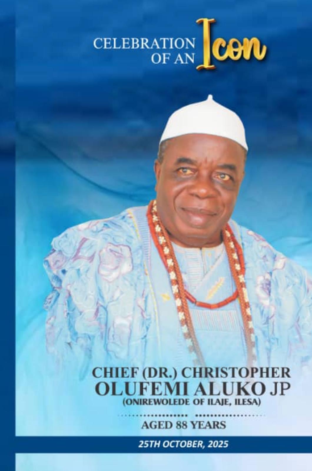 Final burial rites will begin on Thursday, October 23, 2025, with a Service of Songs at his residence: P.1,2 Aluko Crescent, behind Sapaye Compound, off General Hospital Road, Ilesa. A Christian Wake Keep follows on Friday, October 24, and a Thanksgiving Service will be held on Saturday, October 25 at Methodist Church Cathedral, Otapete, Ilesa. Reception and entertainment of guests will take place the same day at Kings Mega Event Centre, University Road, Ilesa.